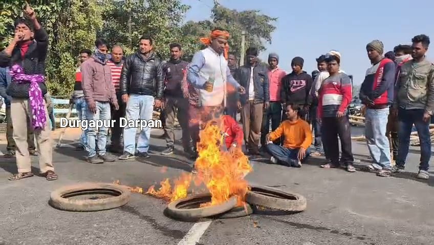 দুর্গাপুর দর্পণ, কাঁকসা: জয়দেব মেলাকে কেন্দ্র করে অজয় নদের উপর অস্থায়ী সেতু নির্মাণের দাবিতে উত্তাল হয়ে উঠল পশ্চিম বর্ধমানের কাঁকসার বিদবিহারের নবগ্রাম এলাকা। বুধবার স্থানীয় বাসিন্দারা ১৪ নং রাজ্য সড়কের জয়দেব সেতু অবরোধ করে বিক্ষোভে সামিল হন। বাঁশ বেঁধে রাস্তা বন্ধ করা হয় এবং টায়ার জ্বালিয়ে চলে প্রতিবাদ। বিক্ষোভের জেরে প্রায় ঘন্টাখানেক ধরে সম্পূর্ণ অবরুদ্ধ হয়ে পড়ে পশ্চিম বর্ধমান এবং বীরভূম, দুই জেলার সংযোগকারী গুরুত্বপূর্ণ এই রাজ্য সড়ক। ফলে দু’দিকেই যান চলাচল বন্ধ হয়ে পড়ে এবং সাধারণ মানুষকে চরম ভোগান্তির মুখে পড়তে হয়।