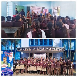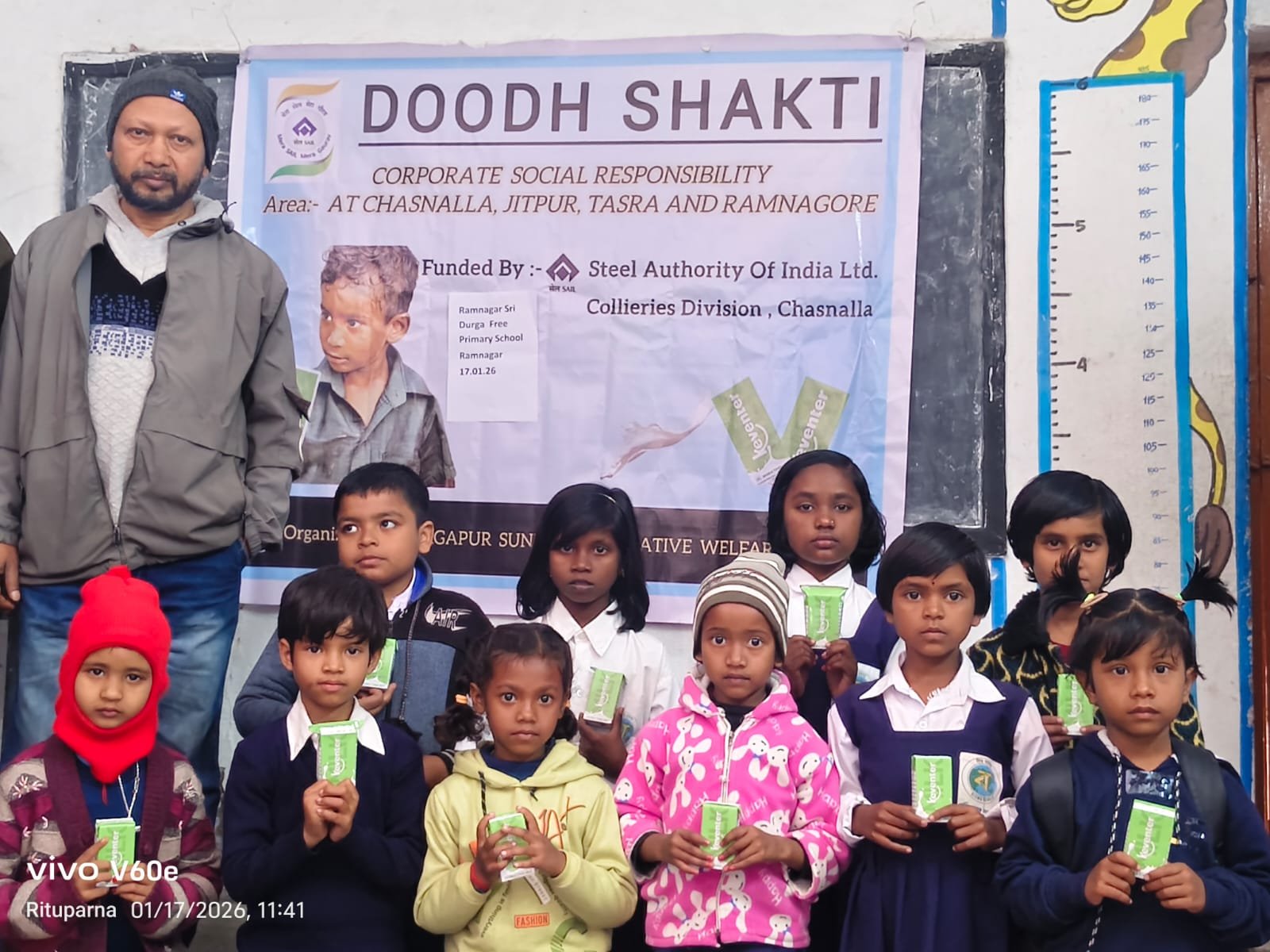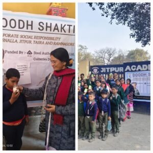 দুর্গাপুর দর্পণ, দুর্গাপুর: শিশুদের শরীরে ক্যালসিয়ামের ঘাটতি পূরণ ও হাড় মজবুত করার লক্ষ্যে ঝাড়খণ্ডের চাসনালা, জিতপুর, তাসরা ও রামনগরের একাধিক স্কুলে শুরু হয়েছে ‘দুধ শক্তি’ প্রকল্প। সেল অথরিটি অফ ইন্ডিয়া লিমিটেড (SAIL) এর চাসনালা কোলিয়ারিজ ডিভিশনের সিএসআর কর্মসূচি এবং দুর্গাপুর সুন্দরম ক্রিয়েটিভ ওয়েলফেয়ার সোসাইটির যৌথ উদ্যোগে এই প্রকল্প নেওয়া হয়েছে। এই কর্মসূচির আওতায় এলকেজি থেকে পঞ্চম শ্রেণির পড়ুয়াদের প্রতিদিন ছোট ছোট দুধের প্যাকেট দেওয়া হবে। শিশুদের নিয়মিত পুষ্টি জোগান নিশ্চিত করাই এই উদ্যোগের মূল লক্ষ্য।