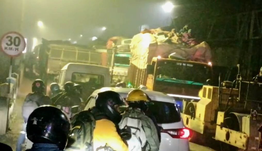 দুর্গাপুর দর্পণ, দুর্গাপুর: বুধবার বিকালে আচমকা পূর্ত দফতর পশ্চিম বর্ধমানের (Paschim Bardhaman) দুর্গাপুরের দুর্গাপুর ব্যারাজ সংলগ্ন দীর্ঘদিনের বেহাল রাস্তা সংস্কারের কাজ শুরু করে। আগাম নোটিশ না দেওয়ায় বা ট্রাফিক ঘুরিয়ে না দেওয়ায় ধীরে ধীরে যানজট হতে শুরু করে। সন্ধ্যার পরে তা ক্রমশ বাড়তে থাকে। আটকে পড়ে হাজার হাজার যানবাহন। এদিকে মুচিপাড়া ও ডিভিসি মোড় থেকে দুর্গাপুর ব্যারাজ, অন্যদিকে ব্যারাজ থেকে বাঁকুড়ার বেলিয়াতোড় পর্যন্ত যানজট হয়। ট্রাক চালকেরা জানান, এক একজন ২-৩ ঘন্টা ধরে দাঁড়িয়ে রয়েছেন। একজন অ্যাম্বুল্যান্স চালক জানান, রোগীকে অপারেশনের পরে দুর্গাপুর থেকে পশ্চিম মেদিনীপুরের গরবেতা নিয়ে যেতে গিয়ে ফেঁসে গিয়েছেন যানজটে।