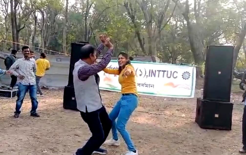 দুর্গাপুর: যুবতীর হাত ধরে INTTUC নেতার ‘ভোজপুরি’ ডান্স! ‘টুট যায় রাজা জি’, ভোজপুরি গানের তালে যুবতীর হাত ধরে উদ্দাম নাচছেন INTTUC এর দুর্গাপুর ১ নম্বর ব্লক সভাপতি মানস অধিকারী। ডিএসপি টাউনশিপের একটি পার্কে INTTUC এর উদ্যোগে বনভোজনের আয়োজন করা হয়েছিল। সেখানেই সংগঠনের ব্যানারের সামনে ব্লক সভাপতির এমন নাচ, বিতর্কের ঝড় তুলেছে দুর্গাপুরে। রীতিমতো ভাইরাল হয়ে গিয়েছে সেই ভিডিও।